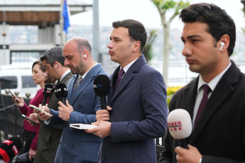 16일 튀르키예 이스탄불의 돌마바흐체 궁전 앞 러시아와 우크라이나 대표단 간의 회담 소식을 각국 언론인들이 보도하고 있다. /AP 연합뉴스 |
