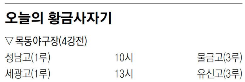 한편 16일 목동야구장에서 열릴 예정이었던 성남고와 물금고, 세광고와 유신고의 황금사자기 준결승은 우천으로 하루 순연됐다. 1경기는 성남고가 물금고에 1-0으로 앞선 1회초 1사 3루에서 재개된다.