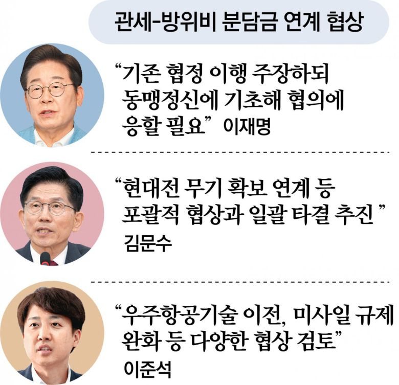 이 후보 측은 미 측에서 거론되는 방위비 분담금과의 협상 연계에 대해선 “한미가 이미 합의한 협정을 성실히 이행할 것임을 주장해야 한다”면서도 “미국이 방위비 분담금 논의를 제의해올 경우 동맹 정신에 기초해 협의에 응할 필요는 있다고 생각한다”며 협의 가능성을 비쳤다.