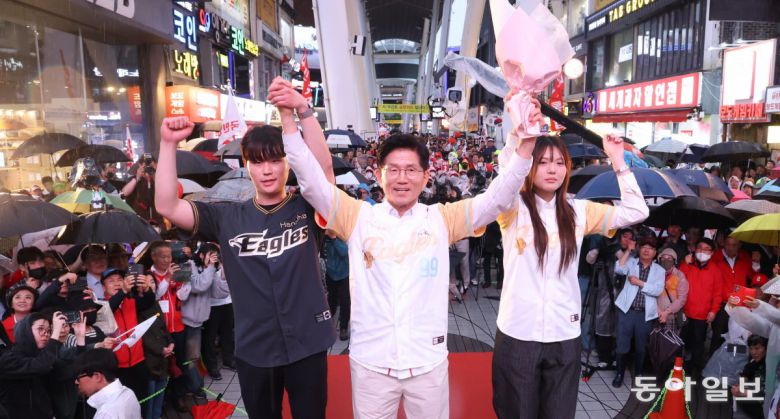 대학생 야구팬들과… 국민의힘 김문수 대선 후보(가운데)가 16일 대전 중구 으능정이거리에서 연 유세에서 대학생들에게 선물 받은 프로야구 한화 이글스 유니폼을 입고 기념 촬영을 하고 있다. 김 후보는 “모든 것에서 세계적인 기적을 창출하는 위대한 대전이 될 수 있도록 김문수가 함께할 것”이라고 말했다. 대전=장승윤 기자 tomato99@donga.com |