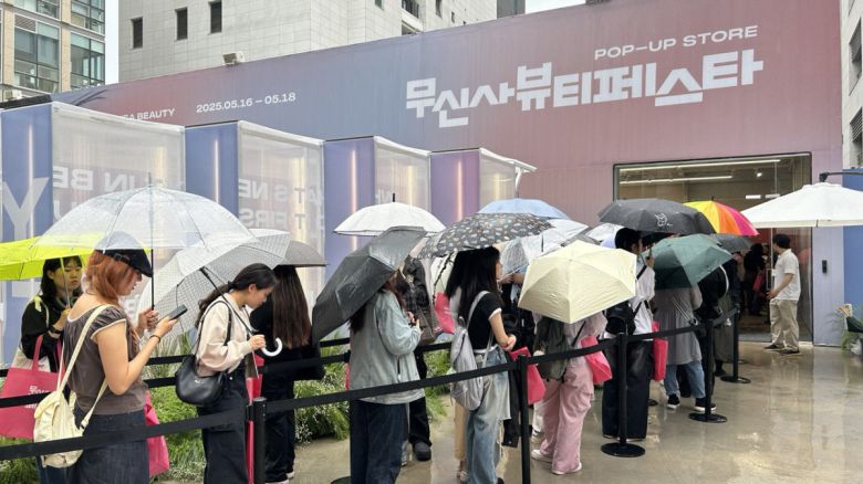 16일 서울 성동구 성수동2가에서 진행된 무신사 뷰티 페스타 팝업 스토어에 우산을 든 방문객들이 줄을 서고 있다. |