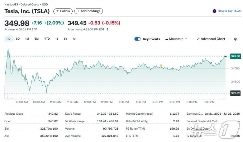 16일(현지시간) 뉴욕증시에서 테슬라는 2.09% 급등한 349.98달러를 기록했다. 이로써 시총도 1조1270억달러로 불었다.