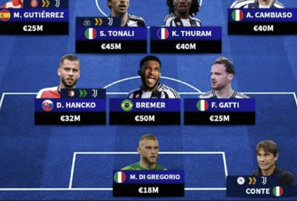 먼저 유벤투스의 경우, 이 매체는 백3로 구성된 수비진에 팀의 기존 수비진인 브라질 출신 브레메르를 중심으로 가티와 더불어 새로운 수비수로 네덜란드 출신 수비수 다비드 한츠코(페예노르트)를 배치했다.