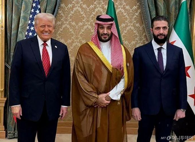 (리야드 AFP=뉴스1) 권영미 기자 = 도널드 트럼프 미국 대통령(제일 왼쪽)과 아흐메드 알샤라 시리아 대통령, 그리고 모하메드 빈살만 사우디아라비아 왕세자가 14일(현지시간) 사진을 찍기 위해 포즈를 취하고 있다. 이 사진은 시리아 아랍 뉴스 통신사인 SANA가 제공했다. 2025.05.14. ⓒ AFP=뉴스1 Copyright (C) 뉴스1. All rights reserved. 무단 전재 및 재배포, AI학습 이용 금지. /사진=(리야드 AFP=뉴스1) 권영미 기자