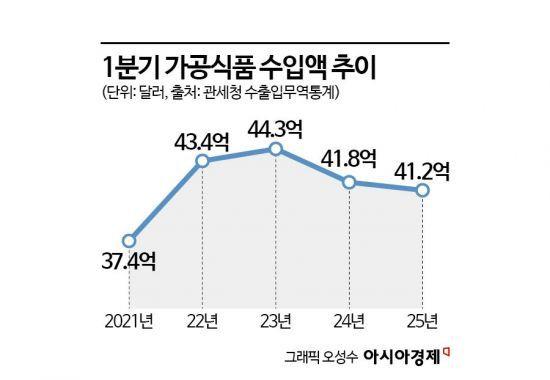 수출액이 최고치를 새로 쓴 가운데 1분기 가공식품 수입액은 41억2000만달러(약 5조7300억원)로 전년 동기(41억8000만달러) 대비 1.3% 감소했다. 주요 수입 품목 중 조제 식료품이 6억7000만달러(약 9300억원)로 가장 높은 수입액을 기록했으며, 이어서 식용 유지(5억7000만달러), 조제사료(5억4000만달러), 채소 및 과실 조제품(3억9000만달러) 등의 순으로 나타났다.