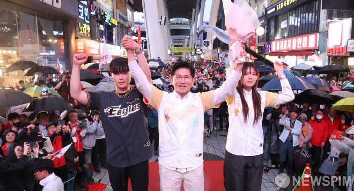 [대전=뉴스핌] 최지환 기자 = 김문수 국민의힘 대선 후보가 16일 오후 대전 중구 으능정이문화의거리에서 한국프로야구 한화 이글스 유니폼을 입고 지지를 호소하고 있다. 2025.05.16 choipix16@newspim.com
