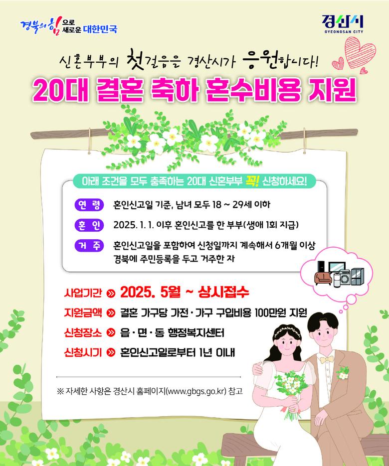 지원 대상은 혼인신고일 기준, 부부 모두 18세부터 29세 이하이며 경산에 거주하는 신혼부부로, 혼인신고일을 포함해 신청일까지 계속해서 6개월 이상 경북에 주민등록을 두고 거주한 경우다.