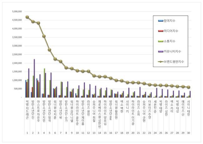 보이그룹 개인 브랜드평판 빅데이터 분석을 위해 2025년 4월 17일부터 2025년 5월 17일까지 보이그룹 개인 755명의 브랜드 빅데이터 72,429,761개를 추출하여 보이그룹 개인 브랜드에 대한 소비자들 행동분석을 가지고 만든 참여지수, 미디어지수, 소통지수, 커뮤니티지수로 브랜드평판지수가 분석됐다. 지난 4월 보이그룹 브랜드 빅데이터 76,428,630개와 비교하면 5.23% 줄어들었다.