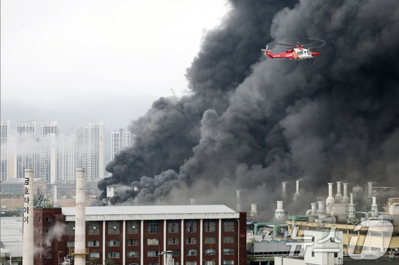 17일 오전 7시 11분쯤 광주 광산구 소촌동 금호타이어 광장공장에서 불이 나 소방당국이 진화 작업을 하고 있다. 2025.5.17/뉴스1 ⓒ News1 김태성 기자