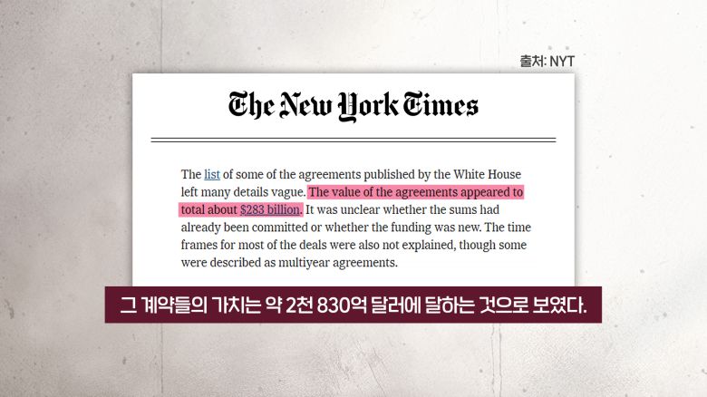 미국 언론에서는 실제보다 규모가 과장이 됐다는 지적이 나오기도 합니다. 예를 들어서 사우디와의 사업 계약은 6천억 달러라고 했지만 실제로는 절반 정도 수준인 2천 830억 달러 정도다. 이게 NYT 뉴욕타임스 보도고요.