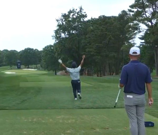 김시우가 17일 PGA 챔피언십 2라운드 16번홀에서 에이스를 기록한 뒤 기뻐하며 홀을 향해 달려가고 있다. [사진=PGA] |