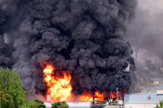 17일 오전 광주 광산구 송정동 금호타이어 광주공장에서 불이 나 검은 연기가 치솟고 있다. 연합뉴스