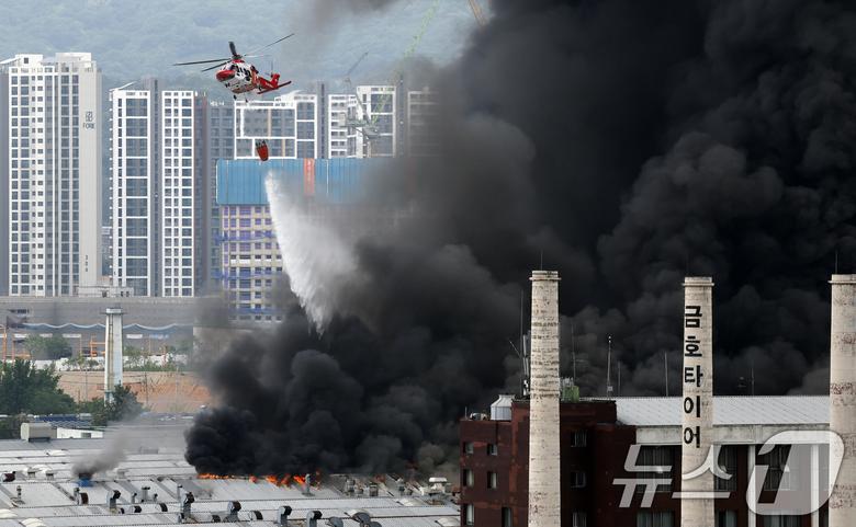 17일 오전 7시 11분 광주 광산구 소촌동 금호타이어 광장공장에서 화재가 발생해 소방당국이 진화 작업을 하고 있다 2025.5.17/뉴스1 ⓒ News1 김태성 기자 |