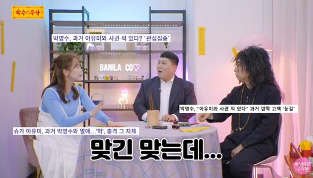 이날 박명수는 아유미에 "예전에 박명수랑 사귀었다는 얘기가 있던데 맞냐"고 물었고, 아유미는 "그 얘기 정말 안 했으면 좋겠다"라고 말문을 열었다. 이에 박명수는 "근데 사귄 건 맞지 않나"라고 되물었고, 아유미는 "맞다. 맞는데 두 시간 사귀었다가 바로 헤어졌다"라고 인정해 눈길을 끌었다.