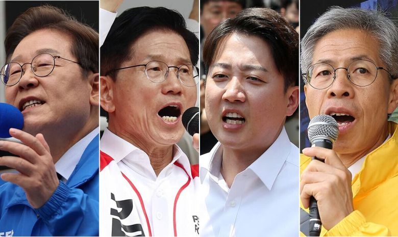 (왼쪽부터) 더불어민주당 이재명 대선 후보가 대구광역시 동성로 거리에서, 국민의힘 김문수 대선 후보가 울산 남구 신정시장에서, 개혁신당 이준석 대선 후보가 대구 경북대학교에서, 민주노동당 권영국 대선 후보가 서울 성신여대입구역 인근에서 집중 유세를 하고 있다. 연합뉴스 |