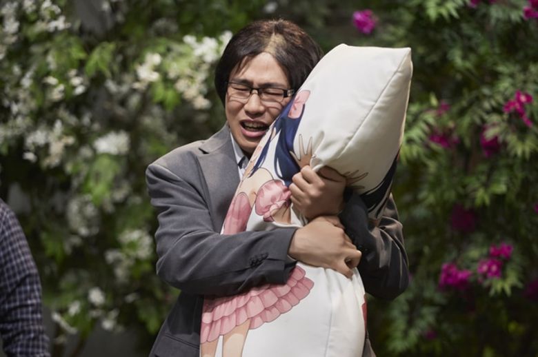 공개된 스틸에는 퍼플 컬러의 가발과 컬러 렌즈, 반짝이는 메이크업을 뽐내는 비주얼 아이돌로 변신한 안재홍이 길거리 팬미팅을 여는 모습부터, 드라마 '마스크걸' 속 '주오남'을 셀프 패러디한 파격적인 장면까지 담겨 있다. 특히 탈모 가발을 쓰고 만화 캐릭터가 프린트된 대형 쿠션을 애지중지하는 '오타쿠' 캐릭터로의 메소드 연기는 이번 7화의 웃음 수위를 기대하게 만든다.