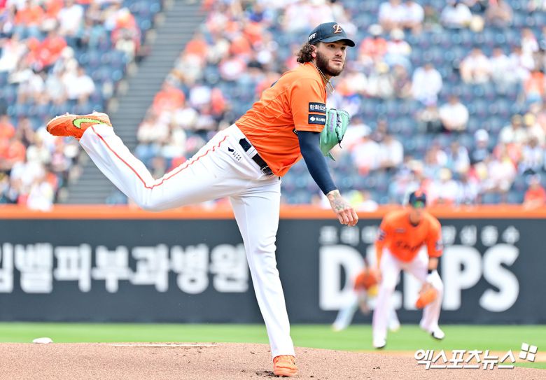 (엑스포츠뉴스 대전, 김한준 기자) 17일 오후 대전 한화생명 볼파크에서 열린 '2025 신한 SOL Bank KBO리그' SSG 랜더스와 한화 이글스의 더블헤더 1차전 경기, 1회초 한화 선발투수 폰세가 공을 힘차게 던지고 있다.