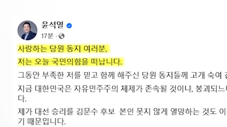 윤석열 전 대통령은 오늘 오전 자신의 SNS에 탈당 의사를 밝혔습니다.