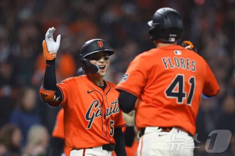 샌프란시스코 자이언츠 이정후(왼쪽)가 17일(한국시간) 열린 2025 메이저리그 애슬레틱스전에서 홈런을 터뜨린 윌머 플로레스를 축하해주고 있다. ⓒ AFP=뉴스1