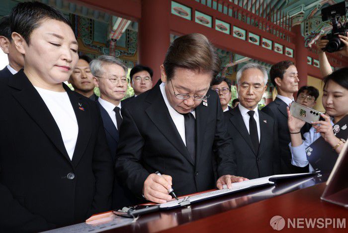 [광주=뉴스핌] 이형석 기자 = 이재명 더불어민주당 대선 후보가 17일 오후 광주광역시 북구 국립 5.18 민주묘역을 찾아 방명록을 작성하고 있다. 2025.05.17 leehs@newspim.com
