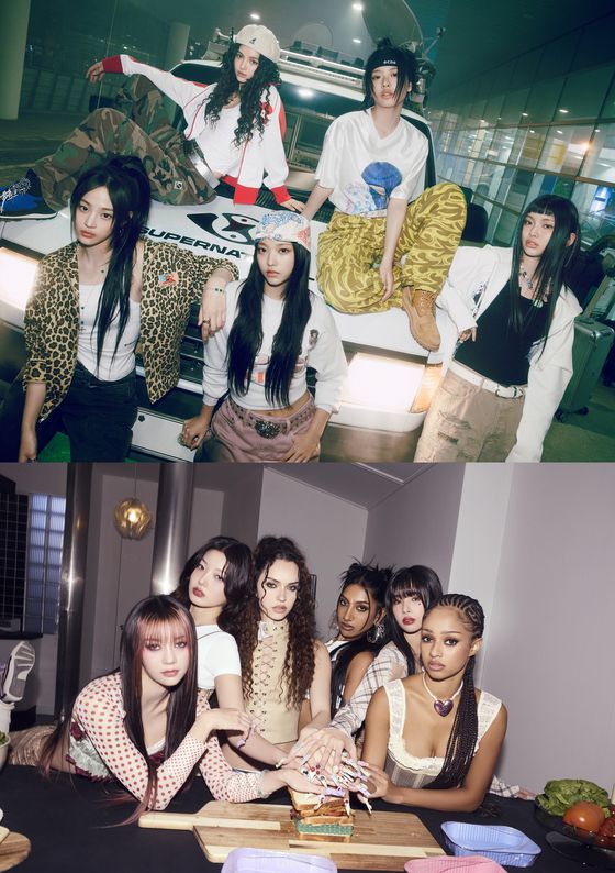 위부터 그룹 뉴진스, 캣츠아이. 어도어, 하이브 레이블즈 제공. |