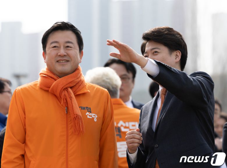 이준석 개혁신당 대표와 김용남 정책위의장이 4일 오후 경기도 화성시 정조로 동탄호수공원에서 열린 제22대 국회의원선거 화성을 출마 선언 기자회견에서 대화를 하고 있다. 2024.3.4/뉴스1 ⓒ News1 이재명 기자