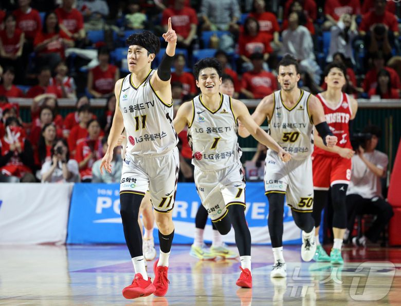 17일 오후 서울 송파구 잠실학생체육관에서 열린 '2024-25 KCC 프로농구 챔피언결정전 7차전' 서울 SK 나이츠와 창원 LG 세이커스의 경기, 4쿼터 창원 LG 허일영이 3점슛을 성공시킨 뒤 세리머니를 하고 있다. 2025.5.17/뉴스1 ⓒ News1 김진환 기자 |