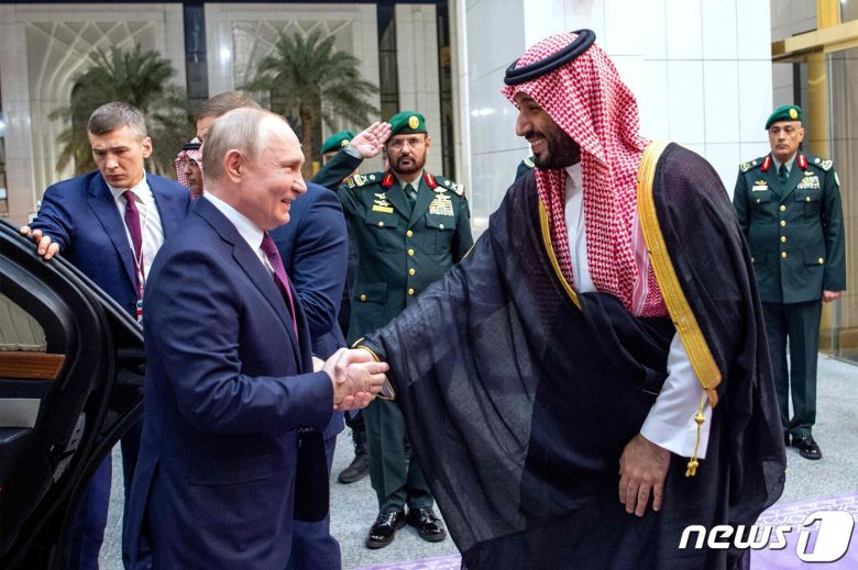 블라디미르 푸틴 러시아 대통령이 6일(현지시간) 사우디아라비아를 방문해 리야드에서 무함마드 빈살만 왕세자와 악수를 하고 있다. 2023.12.7 ⓒ AFP=뉴스1 ⓒ News1 우동명 기자