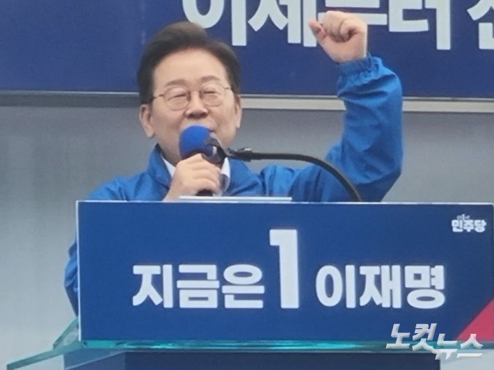 더불어민주당 이재명 대선 후보가 17일 오후 2시 광주 김대중 컨벤션 센터에서 광주 집중 유세를 펼치고 있다. 김형로 기자 |