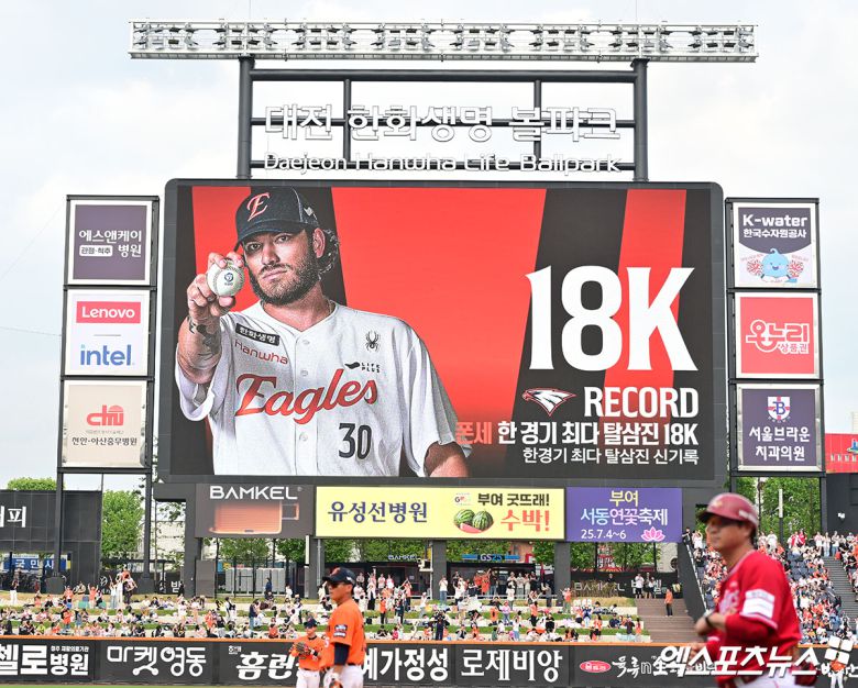 한화 선발 폰세는 8이닝 2피안타 1볼넷 18탈삼진 무실점 괴력투를 KBO 한 경기 최다 탈삼진 타이 기록, 정규이닝 기준 신기록을 달성했다. 종전 기록은 류현진이 지난 2010년 5월11일 청주구장에서 열린 LG와의 홈 경기에서 세운 17탈삼진이다. 연장전을 포함하면 1991년 광주에서 열린 빙그레전에서 한국 야구사 최고의 투수 선동열이 13이닝을 던져 기록한 18개가 최다였다.