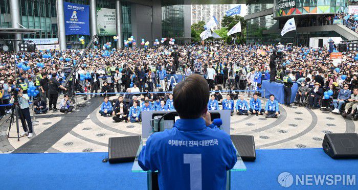 [광주=뉴스핌] 이형석 기자 = 광주시민들이 17일 광주 서구 김대중컨벤션센터 광장에 운집해 이재명 더불어민주당 후보의 유세를 보고 있다. 2025.05.17 leehs@newspim.com