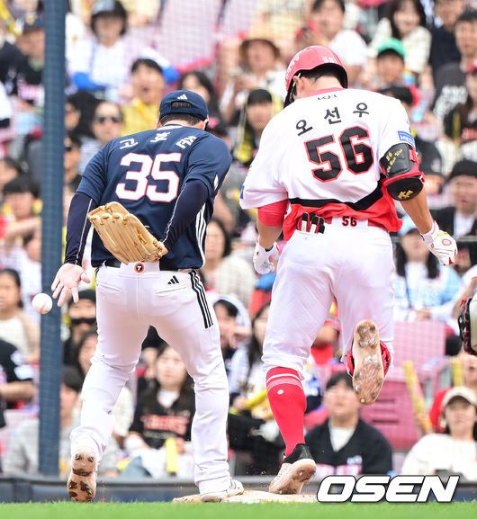 7회말 2사 1루 KIA 오선우의 내야안타 때 베이스 커버 온 두산 투수 고효준이 1루수 양석환의 송구를 놓치고 있다. . 2025.05.17 / ksl0919@osen.co.kr