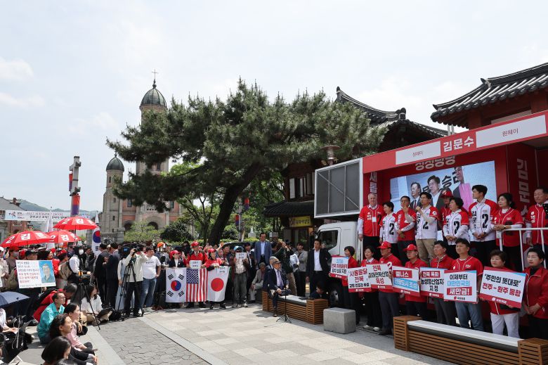 국민의힘 김문수 대선 후보가 17일 전북 전주시 전동성당인근에서 유세하고 있다. /연합뉴스