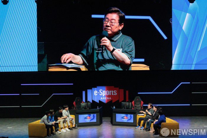 [광주=뉴스핌] 이형석 기자 = 이재명 더불어민주당 대선후보가 17일 오후 광주광역시 조선대 이스포츠경기장에서 이스포츠 산업 현장 간담회를 하고 있다. 왼쪽부터 게임특별위원회 조승래, 강유정 의원, 김세환 넥슨 이스포츠팀 팀장, 박정석 OK저축은행 브리온 이스포츠 단장·전 스타크래프트 프로게이머, 이후보, 배재민 철권 프로게이머(활동명 '무릎’), 천시아(이스포츠 캐스터). 2025.05.17 leehs@newspim.com