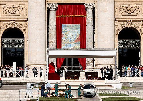 (바티칸 로이터=연합뉴스) 레오 14세 교황의 즉위 미사를 하루 앞둔 17일(현지시간) 바티칸 성 베드로 광장에서 작업자들이 행사를 준비하고 있다. 2025.05.17 photo@yna.co.kr