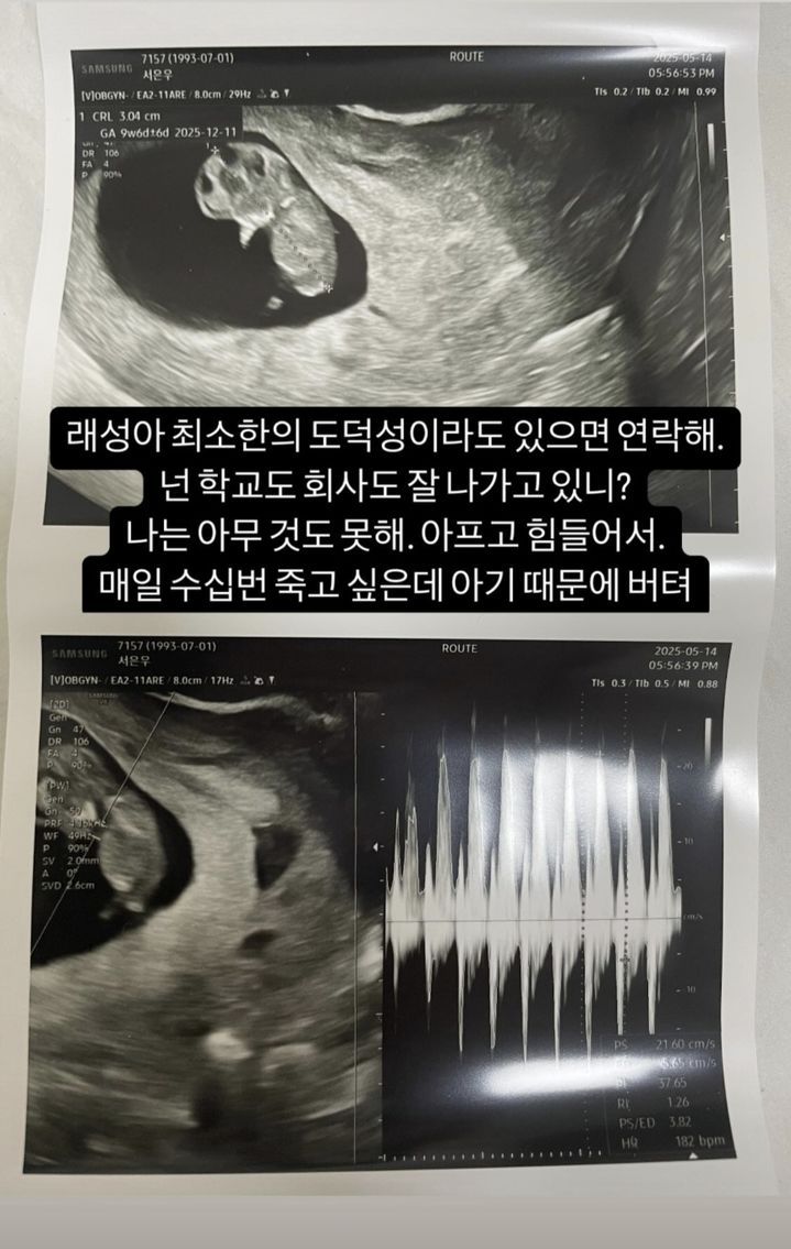 "매일 수십번 죽고 싶은데 아기 때문에 버텨"라고 덧붙이며, 태아 초음파 사진을 올렸다.