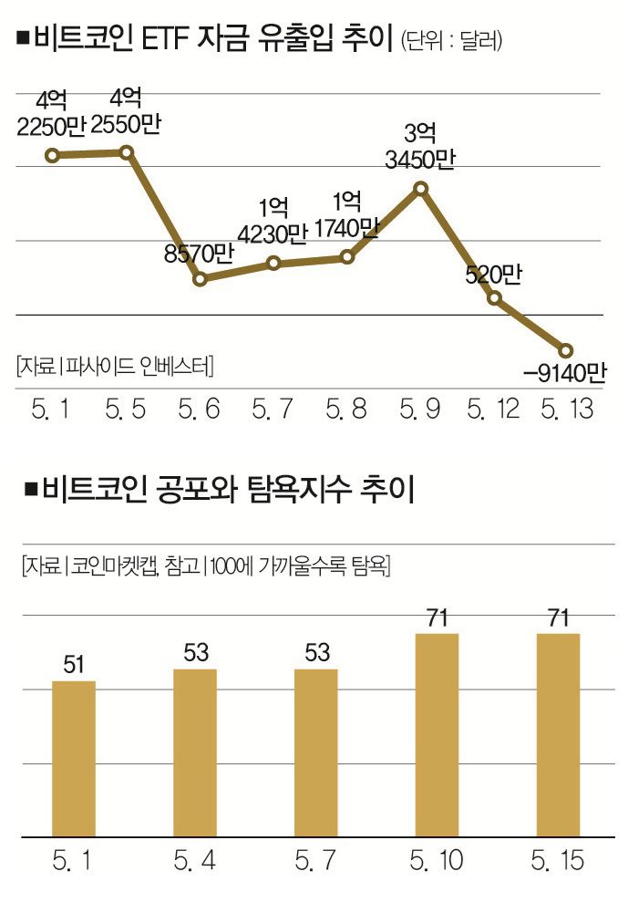 실제로 4월 21일 이후 17거래일 동안 비트코인 ETF에서 자금이 빠져나간 것은 4월 30일(5630만 달러)과 지난 6일(8570만 달러), 13일(9140만 달러) 3거래일에 불과했다. 비트코인 ETF 시장의 자금 흐름에 긍정적인 변화가 나타나고 있다는 얘기다.