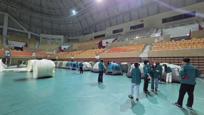 [광주=뉴시스] 박기웅 기자 = 17일 오전 광주 광산구 소촌동 금호타이어 광주공장 화재 현장에서 발생한 검은 연기와 유독가스가 인근 주택가로 퍼지자 행정 당국이 대피소를 마련하고 있다. 이날 광산구는 광주여자대학교 체육관에 400세대가 머무를 수 있는 텐트를 설치할 예정이다. (사진 = 광주 광산구 제공) 2025.05.17. *재판매 및 DB 금지 /사진=박기웅 |