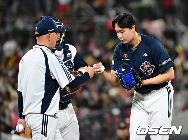 7회초 2사 1루 두산 양재훈이 교체, 박정배 코치와 주먹 하이파이브를 하고 있다. 2025.05.17 / ksl0919@osen.co.kr