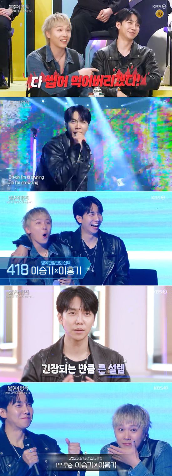 방송 초반부터 티격태격 케미를 자랑하던 두 사람은 우즈의 '드라우닝(Drawning)'을 선곡해 완벽한 호흡을 자랑했다. 이홍기 특유의 파워풀한 보컬과 이승기의 시원한 가창이 더해져 환상적인 무대를 선사, 관객들의 마음을 단번에 사로잡으며 418점의 높은 점수로 1승을 차지했다.