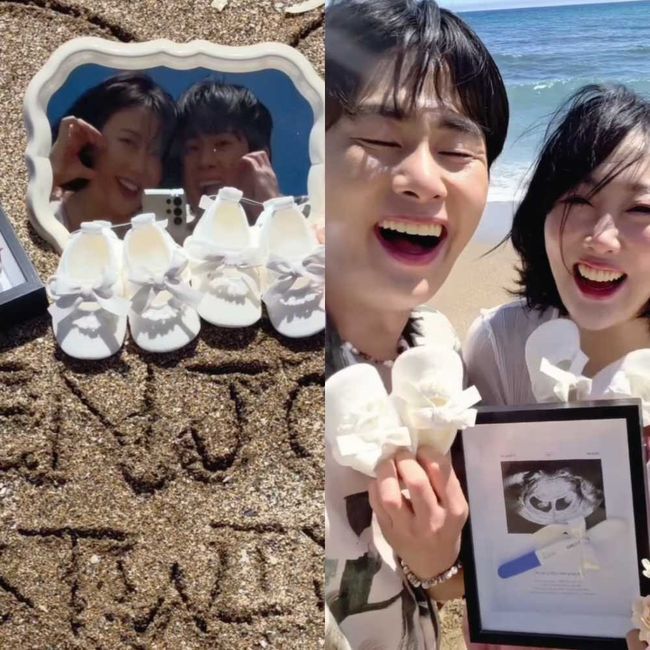 공개된 사진에는 바닷가를 배경으로 해맑게 웃는 두 사람의 모습과 함께 초음파 사진, 아기 신발 네 켤레, 그리고 ‘ENJOY TWINS’라는 문구가 새겨진 모래 바닥이 눈길을 끌었다.