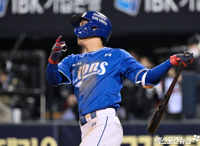 이재현은 원 볼에서 이민석의 2구째 141km/h짜리 슬라이더를 공략, 좌측 담장을 넘어가는 비거리 115m의 타구를 날려 보냈다. 배트에 맞는 순간 홈런을 직감하게 하는 큼지막한 아치를 그려냈다.