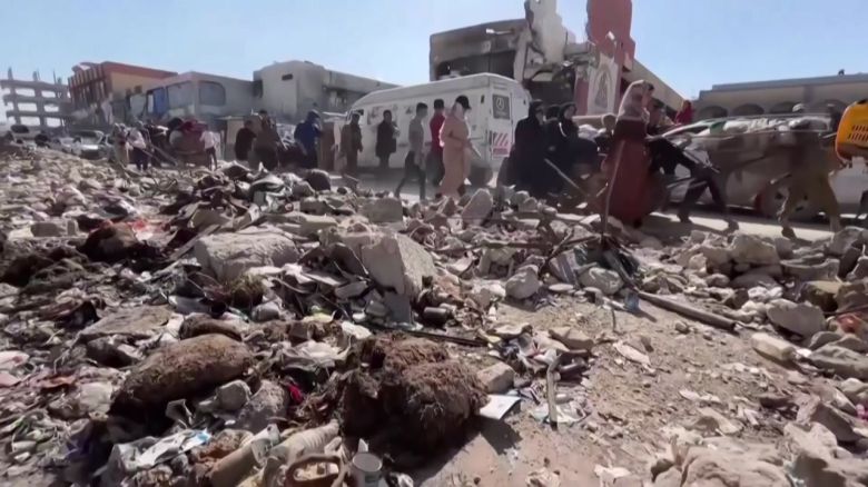 가자지구 곳곳에서는 폭격으로 무너진 건물 사이로 피란길에 나선 주민들의 행렬이 이어지고 있습니다.