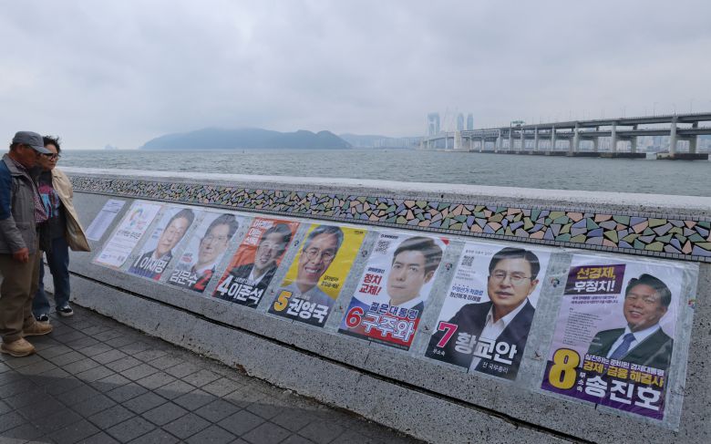지난 15일 부산 해운대구 마린시티로에 제21대 대통령선거 선거벽보가 부착돼 있다. 연합뉴스