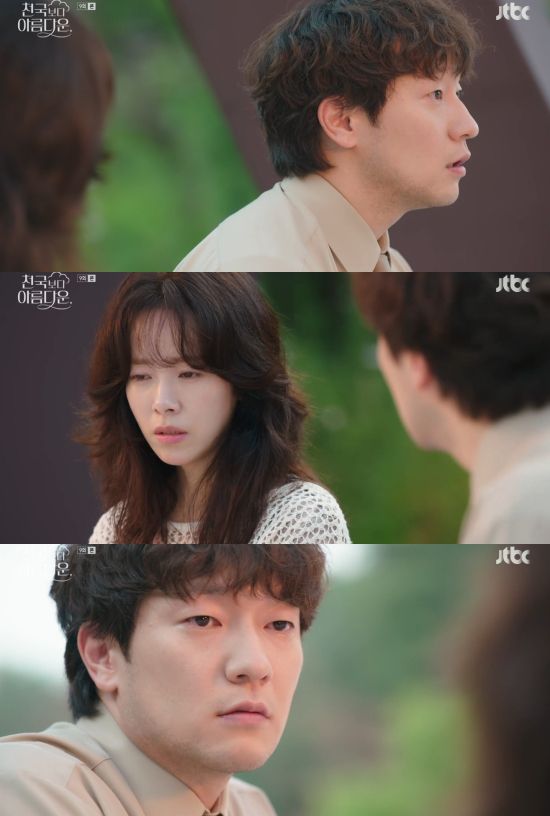 17일 방송된 JTBC 토일드라마 '천국보다 아름다운' 9회에서는 솜이(한지민 분)가 고낙준(손석구)을 지키기 위해 강정구(정진각)의 목을 조른 모습이 그려졌다.