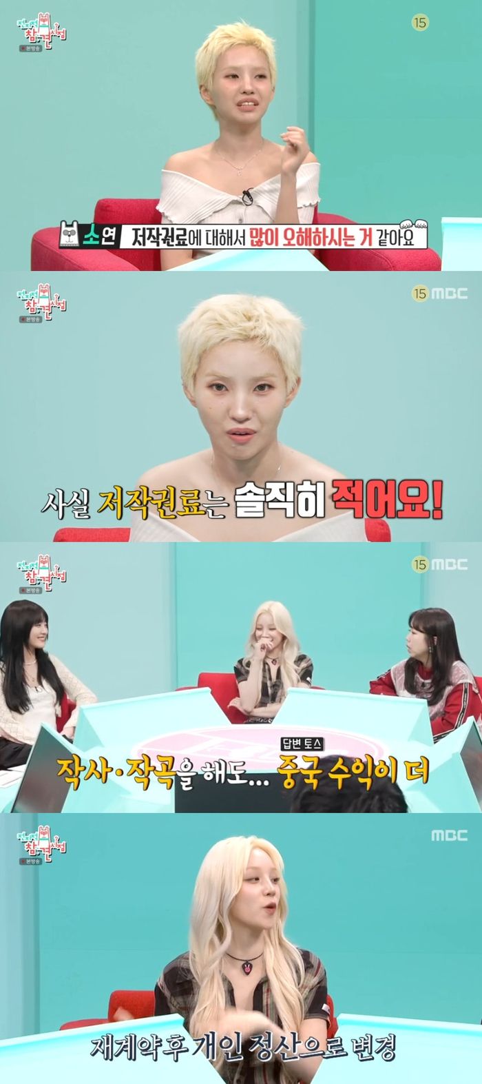 이날 방송에서 전소연은 저작권료가 어떻게 되냐는 홍현희의 질문에 “저작권료를 많이 오해하시는 것 같아요. 그런데 저작권료는 적어요! 작사, 작곡해도 중국 수입이 더 많습니다”라고 털어놨다.