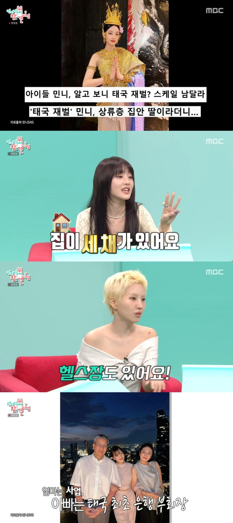 이에 멤버들은 “민니의 태국 집에 가봤는데 그런 집 처음 봤다”, “집이 몇 채가 있다”, “헬스장이 있다”, “공원도 있다”라고 증언해 모두를 놀라게 했다.