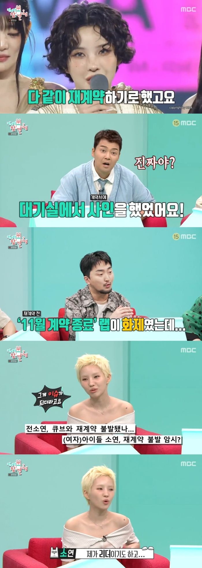 재계약을 위해 힘썼다는 소연은 “리더기도 하고 저희 팀은 다섯 명이 만들었다고 생각해서 다섯 명이서 꼭 하자고 했어요”라고 했다. 미연이 “계약 조건을 위해 소연이 한 명씩 면담하면서 엄청나게 노력했어요”라고 하자 패널은 “변호사 역할도 한 거네”라며 감탄했다. 소연은 “단어 하나씩 바꿨어요”라며 뿌듯해했다.