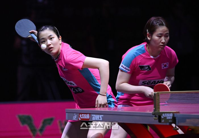 김나영(왼쪽), 이은혜가 17일(현지시간) 카타르 도하 루사일 스포츠 아레나에서 열린 2025 국제탁구연맹(ITTF) 세계선수권대회 여자복식 64강에서 스웨덴 린다 베리스트롬(LINDA BERGSTROM), 크리스티나 켈베리(CHISTINA KALLBERG)조와 경기를 펼치고 있다.