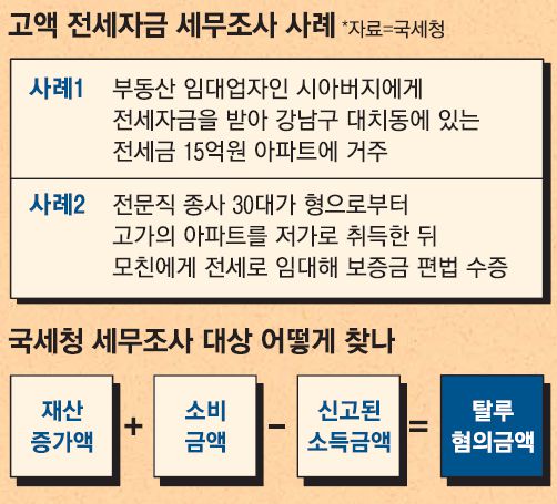 # 30대 김 모씨는 최근 국세청 등기우편으로 ‘납세자 권리헌장’을 받고 가슴이 덜컥 내려앉았다. 이 헌장은 국세청이 김씨에 대한 세무조사를 시작하겠다는 뜻이다. 게다가 자신이 어떻게 10억원에 달하는 고액 전셋집에 살고 있는지를 소명(설명)하라는 자료 요구까지 받았다.